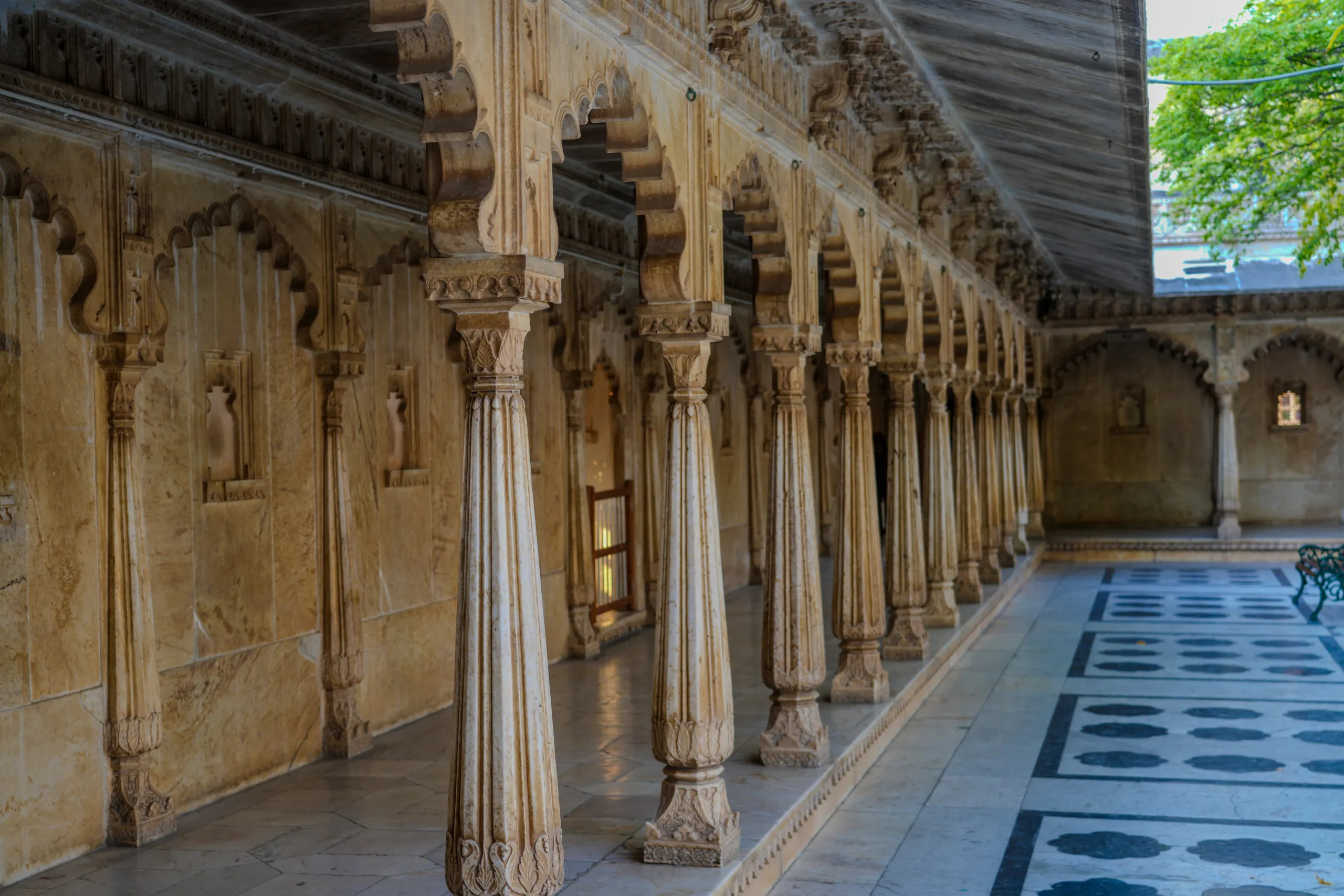 Inside, the palace feels very different. The marble corridor with its repeated arches and carved pillars brings a quieter side of Udaipur, where detail matters as much as scale.